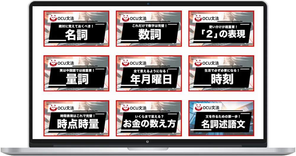 A.中国語単語&フレーズ・文法講義・リスニング講義・スピーキング講義などの動画講義は200本以上あるのでかなり沢山のコンテンツで勉強することができます。また文法書や単語帳などの参考書をそれぞれ買わなくても必要なものが全てOCUに凝縮してあるので購入者の満足度もかなり高くなっています。