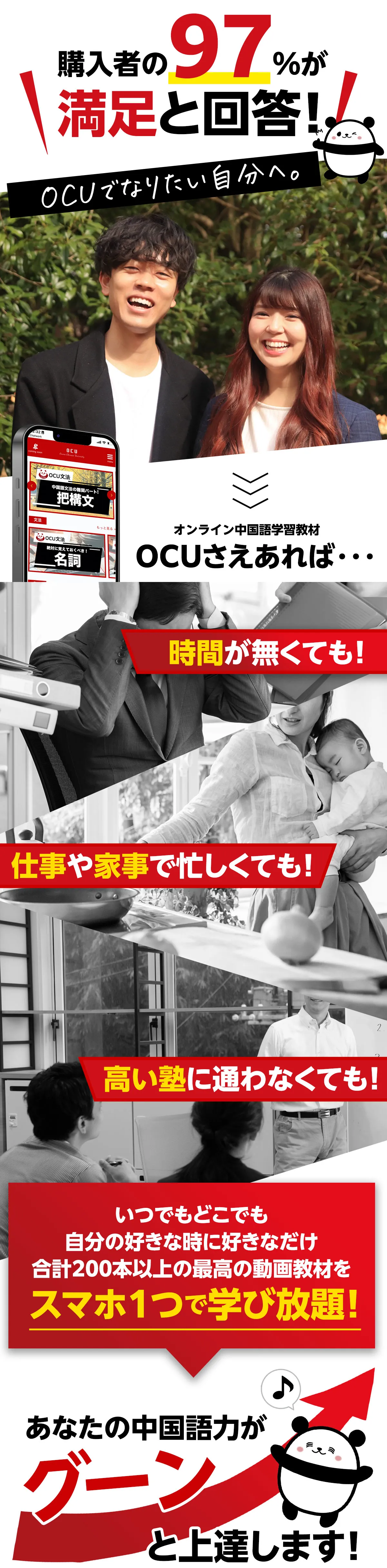 OCUは初心者が学習を開始して知らないうちに上級者になれるような教材だと信じています。中国語の学習に必要なエッセンスが全て盛り込まれておりますし、一つ一つのトピックが短いので無理なく続けられます。携帯でも受講できるので、細切れ時間に何度も聴いているうちに自然に覚えられます。